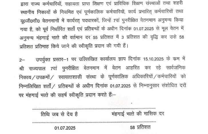 देहरादून। मुख्यमंत्री पुष्कर सिंह धामी के नेतृत्व में राज्य सरकार ने कर्मचारियों को बड़ी राहत देते हुए महंगाई भत्ते (DA) में 3 प्रतिशत की वृद्धि को मंजूरी दे दी है। धामी सरकार लगातार कर्मचारियों के हितों के प्रति गंभीर रही है, और उसी क्रम में सातवें पुनरीक्षित वेतनमान में वेतन आहरित कर रहे सार्वजनिक निकायों, उपक्रमों व स्वायत्तशासी संस्थाओं के अधिकारियों–कर्मचारियों के लिए DA को 55% से बढ़ाकर 58% किए जाने का निर्णय लिया गया है। नई दरें 1 जुलाई 2025 से लागू होंगी।