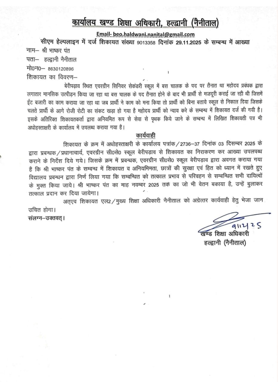 हल्द्वानी (नैनीताल)। बेरीपड़ाव स्थित एवरग्रीन सीनियर सेकेंडरी स्कूल में तैनात बस चालक भाष्कर पंत द्वारा लगाए गए मानसिक उत्पीड़न, मजदूरी कराने और बिना सूचना सेवा से पृथक करने के आरोपों पर शिक्षा विभाग हरकत में आ गया है। प्रकरण सीएम हेल्पलाइन में शिकायत संख्या 9013358 के रूप में दर्ज हुआ था।
