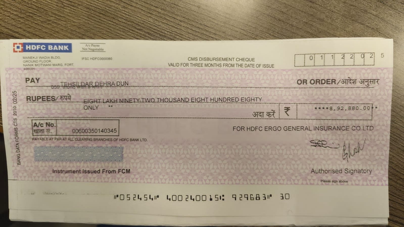 डीएम के फैसलों से बैकफुट पर आया एचडीएफसी आरगो जीआईसी लि०, तहसील में जमा कराया 8.92 लाख धनराशि का चेक