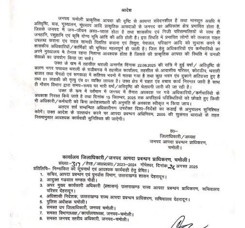 चमोली। जिले में लगातार बारिश और आपदा जैसी परिस्थितियों को देखते हुए जिलाधिकारी संदीप तिवारी ने बड़ा आदेश जारी किया है। उन्होंने सभी अधिकारी-कर्मचारियों के अवकाश पर तत्काल प्रभाव से रोक लगाई है।